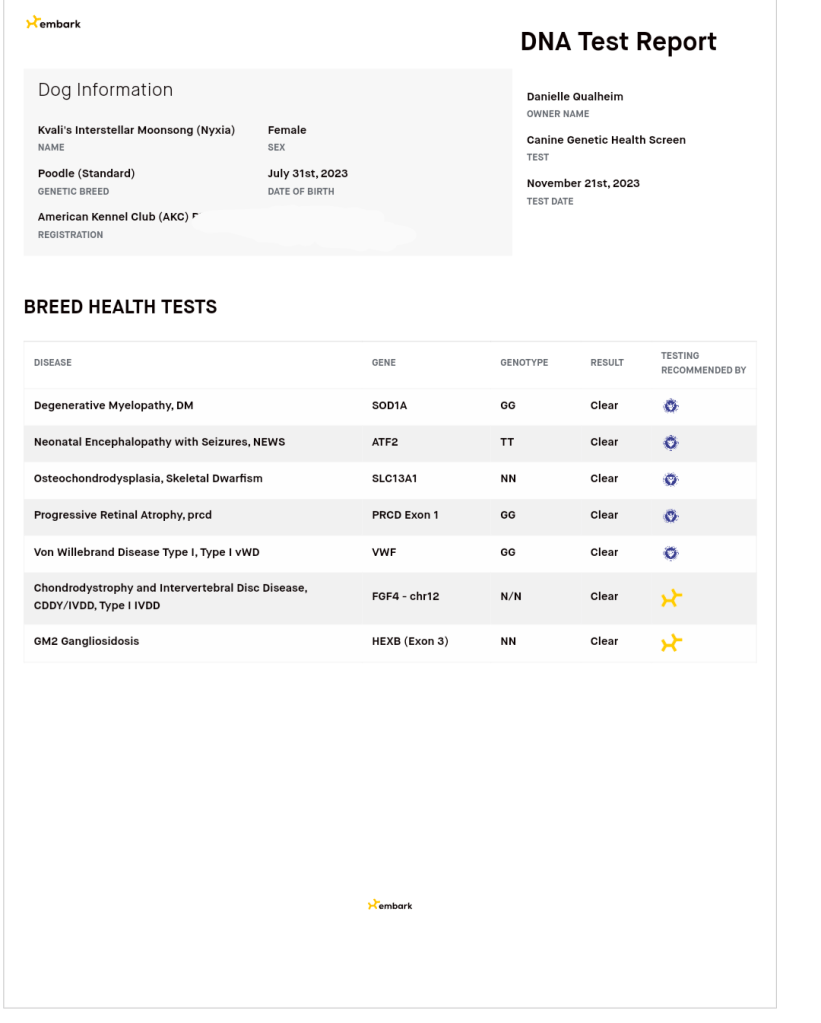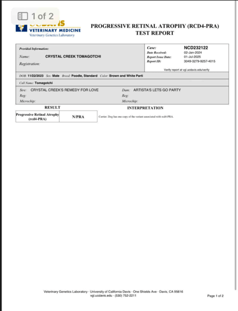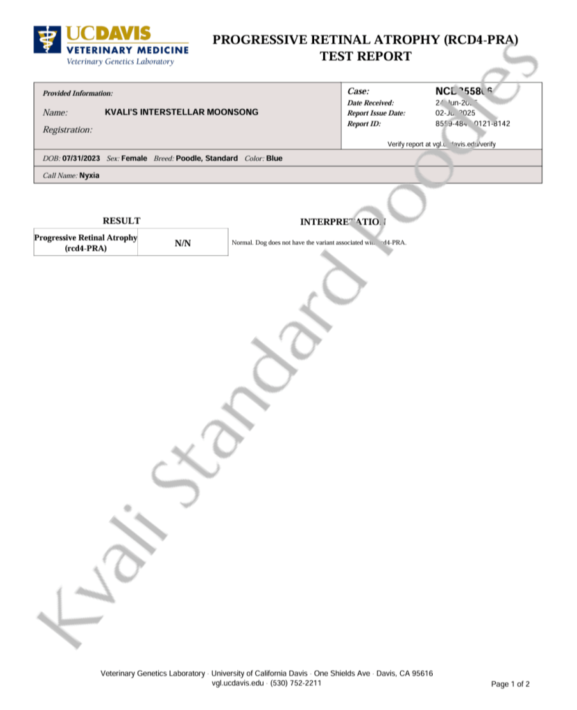 Presto carries a copy for Prarcd4 (not affected) and Nyxia is Clear for Prarcd4. Puppies will NOT be affected as each parent would have to carry a copy for puppies to be affected.